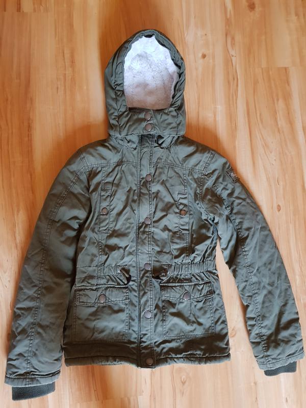 Продаю куртку доньки. Купувала в Німеччині. Розмір 158/164, 12-14 років. Донька одягала небагато разів. Продаю, бо стала вже малою. Радила б на дівчинку звичайної або худорлявої статури, на повненьку буде замала. Куртка тепла, на підкладці. Ззовні 2 кишені зверху і 2 знизу. Рукава на манжетах. Капюшон можна відстебнути, у нього тепла підкладка (видно на фото). Донька носила із задоволенням. Висота по спині 67 см, ПОГ 45 см, висота рукава по плечу 66 см ( по внутрішньому шву 54 см) з манжетом. Склад верхньої тканини 100% cotton.