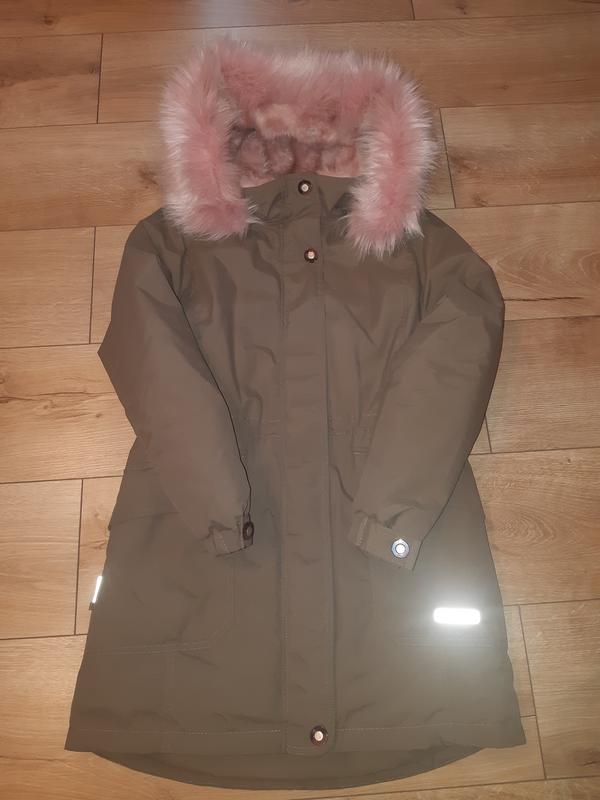 Удлиненная тёплая курточка для девочек 12-13 лет. - Парка пошита из высокотехнологичной ткани Active, которая не пропускает влагу и ветер , и в тоже время «дышит». - Куртка рассчитана на температурный режим -30 градусов. - Утеплённая гипоаллергенным и легким материалом Isosoft (330 г). благодаря которому, ребёнку будет комфортно и тепло во время зимней прогулки. - Парка имеет глубокий утеплённый съёмный капюшон с искусственным мехом. - Воротник-стойка полностью закрывает шею. - Капюшон и манжеты застегиваются на липучки. - Спереди есть 2 вшитых кармана с клапанами. - Парку приталена куліскою, застібається на блискавку, прикриту планкою. - Є світловідбиваючі елементи. - - Колір парки - хакі, узлісся і підкладки - рожевий. Заміри: довжина від горловини 68 см, довжина по спинці довше 80 см, довжина рукава 56 см, ширина по грудях 48 див. Стан нової. Замовляла з Естонії.