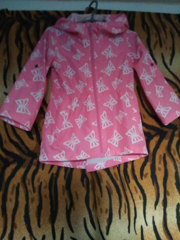 Шикарная парка для девчушки-принцессы розового цвета с белыми бабочками-стильная,фирменная,легкая,непромокаемая,застегивается на замок-молнию впереди,есть капюшон,на талии чуть присобирается на резиночки,впереди внизу два карманчика на замках-молниях,рукавчики могут быть длинные,могут подстегиваться на кнопки,сзади чуть длинее,совсем,как у взрослых,и по центру внизу разрезик.