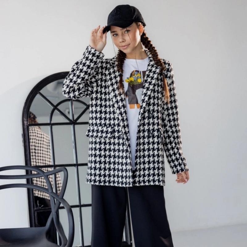 Модный жакет Ткань-твидовая пальтовка принт "гусяча лапка", шерстяная ткань мягкая на ощупь. Застегивается на пуговицы ирис долж/рукав/п********** 146р-64/50/45 152р-67/52/47 158р-68/55/49 164р-73/59/51 +-2 см