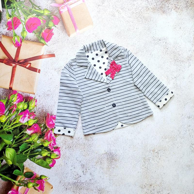 Крутой пиджак в полоску на 3-4 года классно смотрится в полностью новом состоянии пиджак трикотажный мягкое ширина 32 см длина 36 см длина рукава 33 см рукав можно откатить и будет 36 см цена 210 грн