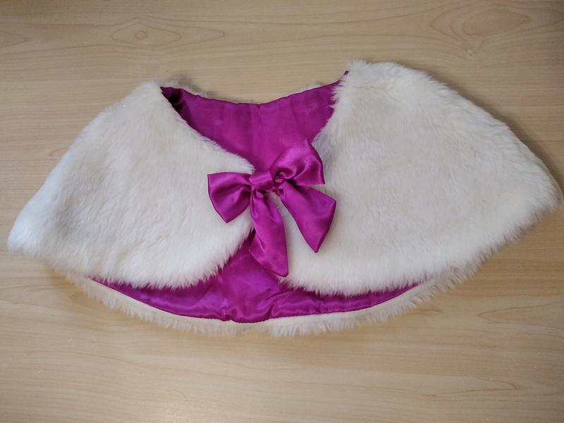 белая накидка из меха, на розовой атласной основе с бантом, закрепляется на пуговицу, ширина по верху 19, ширина по низу 48, длина 21 см