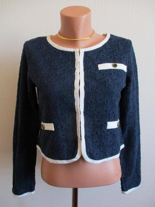 Кружевной хлопковый легкий жакет next В отличном состоянии, без дефектов, секонд Застегивается на крючки, на спинке внизу по центру есть разрез На подкладке Размер указан 15 лет, но подойдет и на больше, примерно на 40-44 укр.размер, ориентируйтесь на замеры: Замеры изделия (немного тянется): ПО груди - 45 см ПО бедер - 44 см Ширина по плечам - 39 см Длина - 41 см Длина рукава - 59 см ................................. Состав: 79%-cotton, 21%-nylon Подкладка: 100%-cotton .......................................... Данный товар безопасной оплатой не отправляем. ......................................... SALE! При покупке 2-х и больше вещей - скидка 10% *** Если Вы делаете заказ через кнопку "Купить" скидку сделать не смогу, поскольку в этом случае сайт снимает с меня процент за продажу с полной стоимости вещи, указанной в заказе. Для получения скидки делаете заказ через кнопку "Задать вопрос"! .................................... Доставка: Отправка после 100% предоплаты на карту. Доставка: Новая Почта, Укрпочта (оплата за доставку при получении посылки) . На выходных отправок нет. ВОЗВРАТА И ОБМЕНА НЕТ! В каждом объявлении есть детальное описание и замеры вещи. Как сядет на Вас вещь, я предугадать не могу, поэтому делайте заказ обдуманно, сверяйте свои параметры с указанными замерами. Я с удовольствием отвечу на все интересующие вопросы и предоставлю дополнительные замеры и фото ДО оплаты и отправки товара