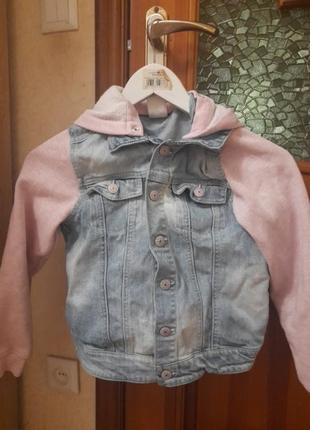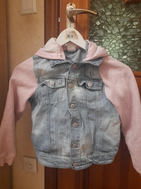Джинсова куртка (піджак) на вік 9-10 років.Капюшон і рукава на флісі .Хороший стан ,але є дефект на рукавах на правому передостаннє фото затягнено нитку(2 невеличкі дірочки ) лівий рукав плямка ледве помітна(останнє фото).При носінні цього взагалі не видно.Кнопки всі робочі.Капюшон відстібається.