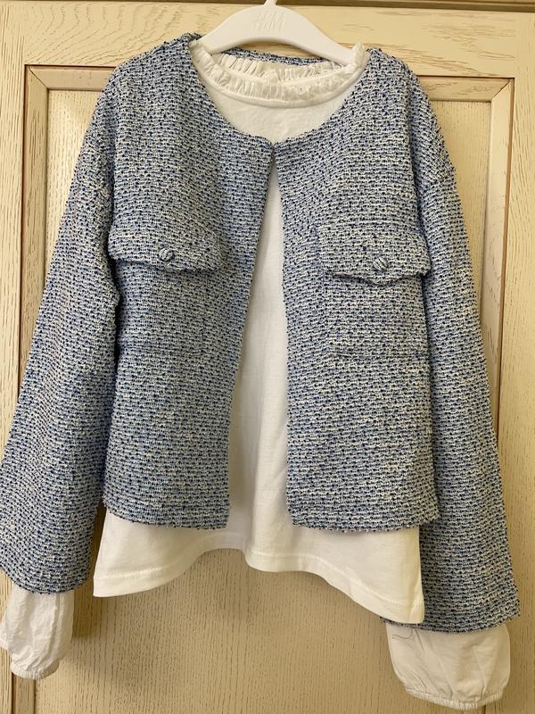 Брендовый, красивый, твидовый, бирка отсутствует(: на груди- два кармана.Блуза с вышиванными рукавами -500 грн. Белого цвета- зад и перед трикотаж- рукава- хлопок.