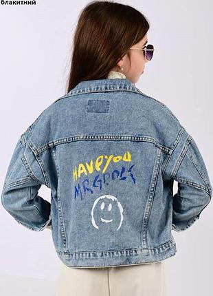 Стильна підліткова джинсівка. Встигніть придбати! Кількість по такій ціні обмежена! кармани-обманки розмір-130 ,140 трохи маломірять. заміри є на фото, але уважно!! рукав -заміри від комірця, взагалі моделька ,як видно на фото - з укороченим рукавчиком.