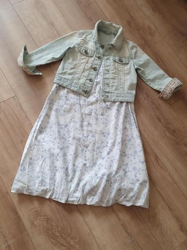 Набором нежное платье Benetton и джисовая куртка в идеальном состоянии. На размер 104-110см, на 3-5 лет. Платье свободного кроя, длина 65.5см, ширина под по грудь 37см. Куртка длина от плеча 35см, ширина 32.5см, длина рукава от плеча 37см. Набором 350грн, отдельно каждая вещь 200грн.