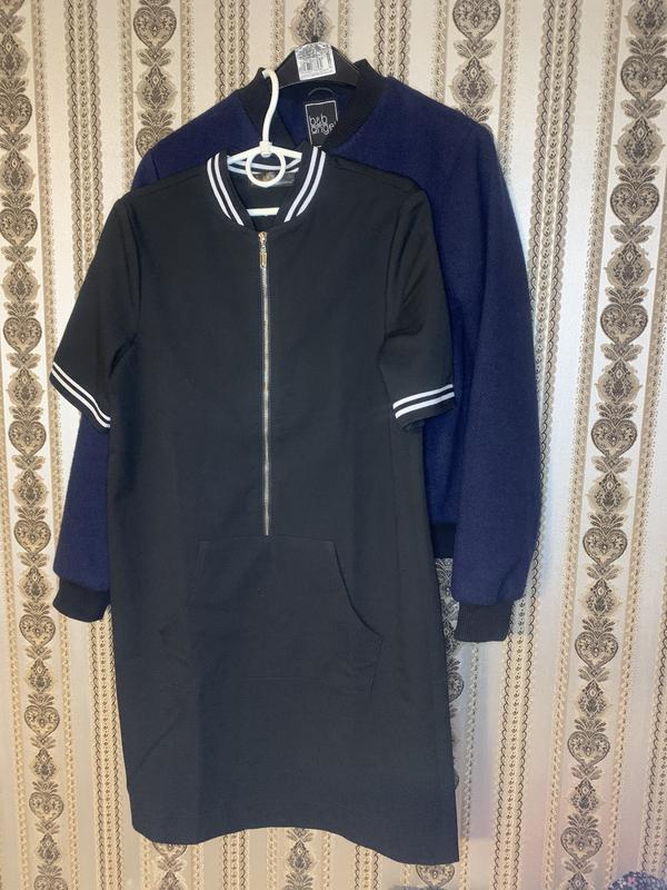 Состояние красивое, вещи качественные. Платье черного цвета с белыми полосками на манжетах на рукавах и воротничке, застежка- молния, карманы кенгуру, свободного кроя. Бомпер- темно-синего цвета, манжеты по низу, на рукавах и воротничке- черного цвета, застежка- металлическая молния. Вещи полномерные.