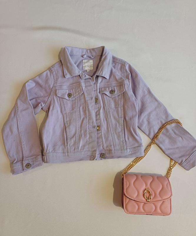 Джинсовая курточка для девочки светло фиолетового цвета. Имеет небольшие дефек фото добавила. Длина от плыча 38см, талия 38см, рукав 42см.
