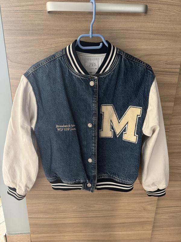 Джинсовий бомбер Zara 11-12років 152 см Трохи утеплений з підкладкою. Можна вдягати замість куртки, весна/осінь. Довжина по спинці 52см Рукав від плеча 50 см Ширина 48-50см