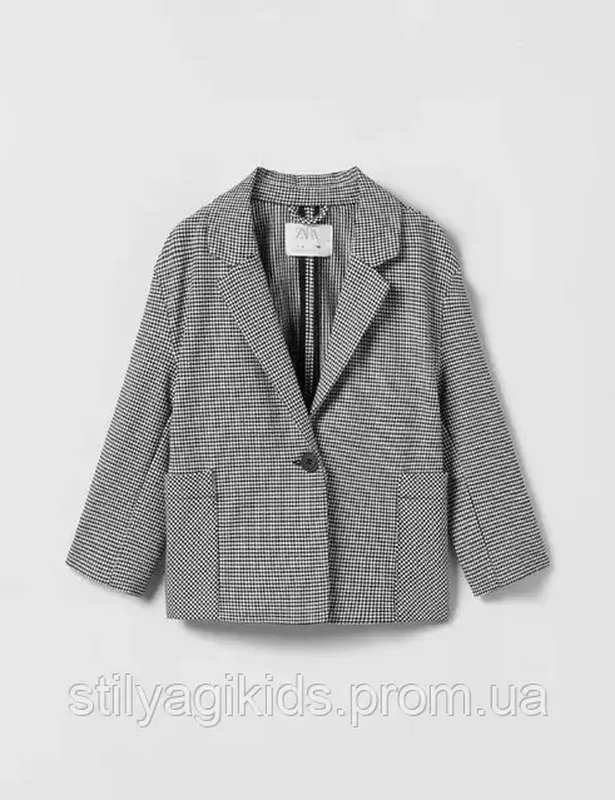 Детский черно-белый пиджак бренд ZARA для девочки.Модель в клетку без подкладки. Ткань изделия плотная и хорошо держит форму, в состав входят: 62% полиэстер, 33% вискоза и 5% эластан. Жакет застегивается на пуговицу спереди, имеет отложные бортики и длинный рукав. Спереди большие накладные карманы, которые могут выполнять как декоративную функцию, так и по прямому назначению. Эту модель можно стилизировать как с классическими вещами, так и стильный образ выйдет с юбками, футболками, джинсами. Артикул товара 1174/241/064 Бренд, который производится - ZARA Страна изготовления - Morocco