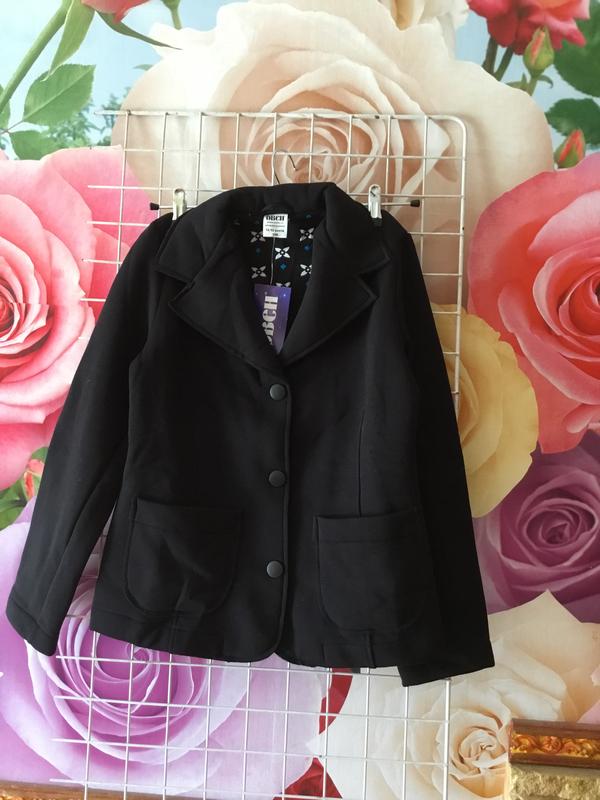 Стильный, трикотажный пиджак для девочки, отличного качества, производства Украины, торговая марка Овен, идеально подходит для осени и школы и под любой низ. Ткань трикотаж- трехнитка плотная с начесом, очень мягкая и приятная к телу. Очень удобный в носке, не сковывает движений, удобно сидеть за партой. Застегивается на кнопки и по бокам идут карманы. Супер пиджак. Супер качество, новый с биркой, цена снижена, стоил 570. Есть размер на рост 140,146,152 Цвет- насыщенно чёрный.