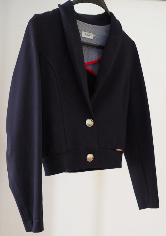 Шкільний піджак темно-синій, укорочений, для дівчинки. Фірма RMX, зроблено в Польщі. З-за помилки на сайті показує Designers' Remix Collection, але це не так. Розмір 158. Рукав 53,5 см, довжина - 43, груди - 42,5. Склад: віскоза 58%, нейлон 37%, еластан 5%. Шкільна форма.