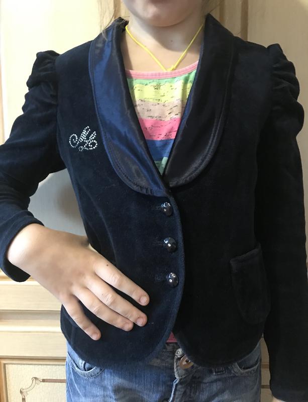 Продаём наш школьный пиджак, темно-синий цвет. Фирма Маленькая леди. В отличном состоянии, без дефектов. Размер указан р.134-64 Но на фото одето на рост 133 см и нам он мал. 95% хлопок и 5% эластан ЗАМЕРЫ : длина 42 см Рукав 45 см По груди 33,5 см По спине 27 см