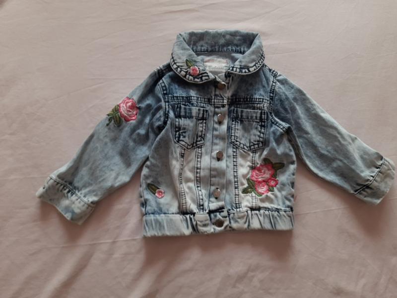 Джинсовая ветровка, пиджак на 1-2 года. Украшена вышитыми цветами. Дефектов нет, нужно погладить после стирки. Дорогая эффектная вещь. Длина 35см, между подмышками 32см, плечи 25 см, рукав 30см.