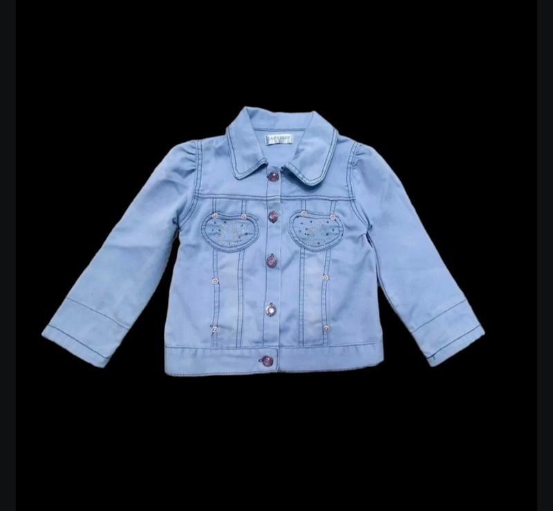 Классная джинсовка для девочки. Состояние хорошее. Есть мелкие нюансы: поцарапаны пуговицы, затяжка, пара практически незаметных пятнышек. (Показала на последних 5 фото) Если специально не рассматривать - незаметно. Замеры: ПОГ 31, длина 40, рукав 37см