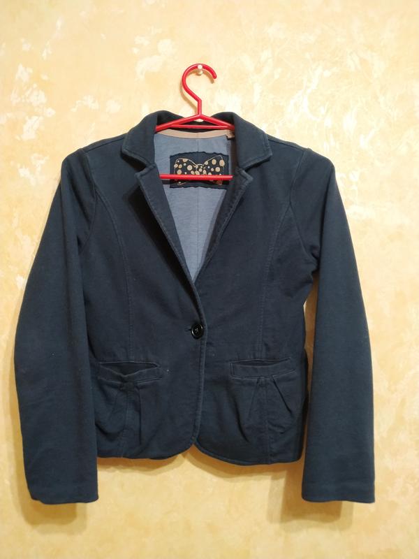 Жакет из трикотажа на одной пуговице, черного цвета. Подкладка тоже трикотаж, только серого цвета. Есть два кармана.