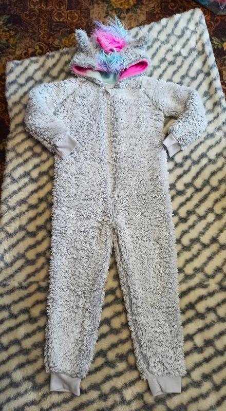 Теплый слип для девочки единорог F&F. Размер - 6-7 лет. Замеры: - длина рукава (от капюшона) - 48 см, - ПОГ - 36 см, - ПОТ - 35 см, - ПОБ - 37 см, - шаговый шов - 49 см, - длина от плеча - 99 см. Ткань - велсофт. Очень плотный и теплый. Состав: 100% полиэстер. Состояние отличное