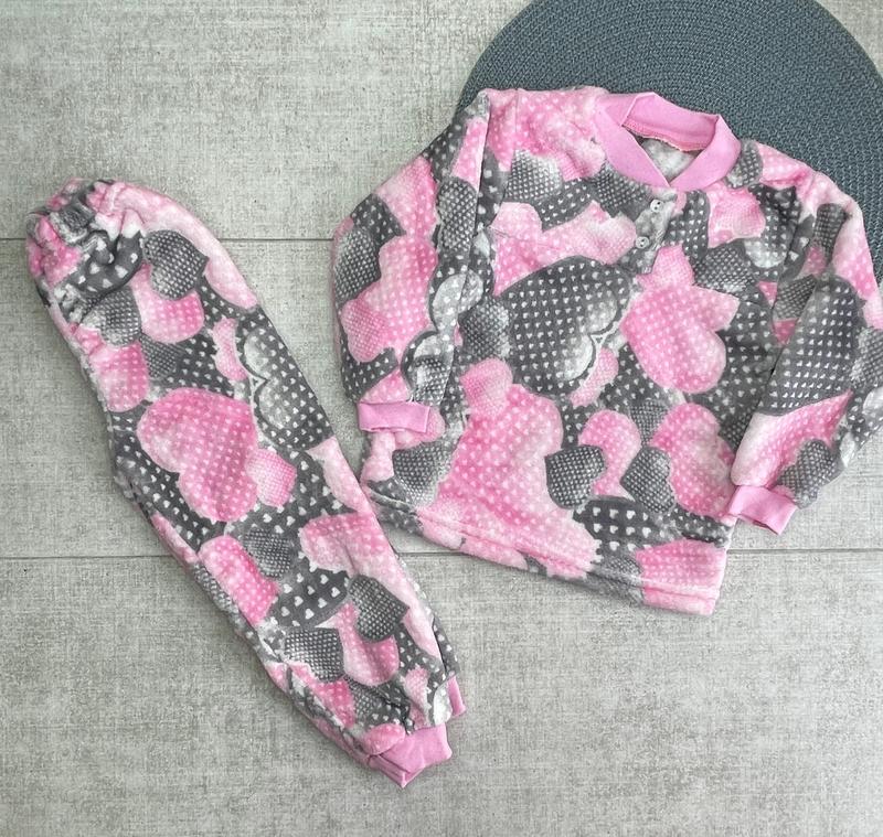 Тепла махрова піжама ✨ Якість супер👌 Яскраві та гарні 😍 Розмір рекомендуємо обирати по замірам 28 розмір (98-104) - штани довж - 56 см,крок - 35 см,кофта довж - 39 см,шир - 29 см,рукав 29 см(2шт) сердечки
