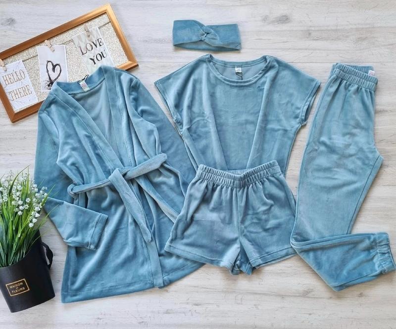 Мега новинка Комплект 5в1 Тканина королівський велюр В комплект входять: -футболка-топ, -шорти -штани під РЕЗИНКУ -халат з поясом -пов'язка ЯКІСТЬ СУПЕР! ПОВНОМІРНІ!!! 134(3 шт+1 шт в наявності)-довжина халата 61,рукав 47,пог 41,довжина футболки 40,пог 42,довжина штанів 80,крок 60,пояс 25,довжина шортів 26,пояс 25 140(3 шт+1 шт в наявності)-довжина халата 63,рукав 48,пог 43,довжина футболки 42,пог 43,довжина штанів 86,крок 65,пояс 26,довжина шортів 27,пояс 26 146(3 шт)-довжина халата 69,рукав 50,пог 44,довжина футболки 46,пог 45,довжина штанів 92,крок 70,пояс 27,довжина шортів 28,пояс 27 152(2 шт)-довжина халата 72,рукав 52,пог 48,довжина футболки 47,пог 47,довжина штанів 98,крок 73,пояс 28,довжина шортів 30,пояс 28 158(2 шт)-довжина халата 75,рукав 57,пог 50,довжина футболки 49,пог 48,довжина штанів 102,крок 78,пояс 29,довжина шортів 32,пояс 29 164(2 шт)-довжина халата 77,рукав 60,пог 51,довжина футболки 51,пог 50,довжина штанів 105,крок 82,пояс 30,довжина шортів 33,пояс 30 +-2 см