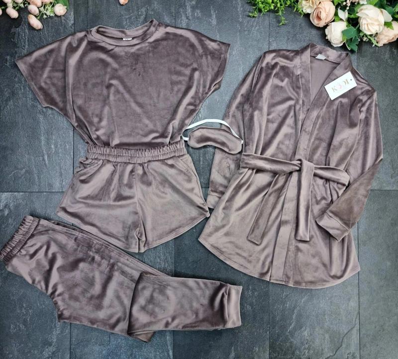 Модняшка СУПЕР КОМПЛЕКТ! Велюрова піжама 5 в 1 халат з поясом футболка-топ шорти єкишені штани маска на очі Колір - шоколад. Заміри: 152 халат довжина - 72см, напівобхват грудей - 44см, рукав від горловини - 60см. штани довжина - 88см, крок - 64см, пояс - 28см. футболка довжина - 50см, напівобхват грудей - 43см. шорти довжина - 24см, пояс - 28см. 158 халат довжина - 74см, напівобхват грудей - 46см, рукав від горловини - 62см. штани довжина - 91см, крок - 67см, пояс - 29см. футболка довжина - 51см, напівобхват грудей - 45см. шорти довжина - 25см, пояс - 30см. 164 халат довжина - 76см, напівобхват грудей - 48см, рукав від горловини - 64см. штани довжина - 94см, крок - 70см, пояс - 31см. футболка довжина - 52см, напівобхват грудей - 47см. шорти довжина - 26см, пояс - 32см.