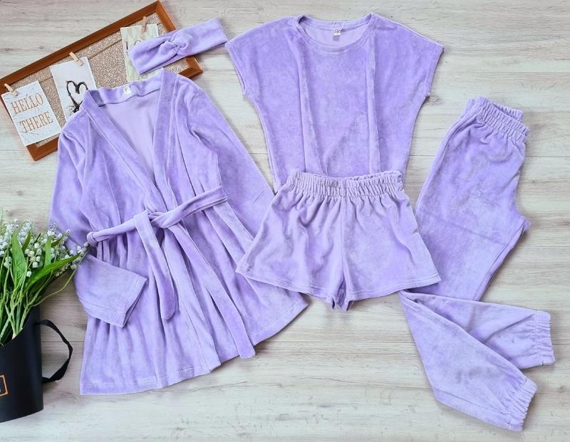 НАЯВНОСТИ Мега новинка Комплект 5в1 Ткань королевский велюр В комплект входять: -футболка-топ, -шорти -брюки под РЕЗИНКУ -халат с поясом -повязка КАЧЕСТВО СУПЕР! ПОЛНОМЕРНЫЕ!!! 134(3 шт)-длина халата 61,рукав 47, пог 41,длина футболки 40, пог 42,длина брюк 80,крок 60,пояс 25,длина шорт 26,пояс 25 140 (нет)-длина халата 63,рукав 48, пог 43, длина футболки 42, пог 43, длина брюк 86, крок 65,пояс 26,длина шорт 27,пояс 26 146 (нет)-длина халата 69,рукав 50,пог 44, длина футболки 46, пог 45, длина брюк 92, крок 70,пояс 27,длина шорт 28,пояс 27 152(2 шт)-длина халата 72,рукав 52, пог 48, длина футболки 47, пог 47, длина брюк 98, крок 73,пояс 28,длина шорт 30,пояс 28 158(1 шт)-длина халата 75,рукав 57, пог 50,длина футболки 49, пог 48, длина брюк 102, крок 78,пояс 29, длина шорт 32,пояс 29 164(нет)-длина халата 77,рукав 60,пог 51,длина футболки 51,пог 50,длина брюк 105,крок 82,пояс 30,длина шорт 33,пояс 30 +-2 см