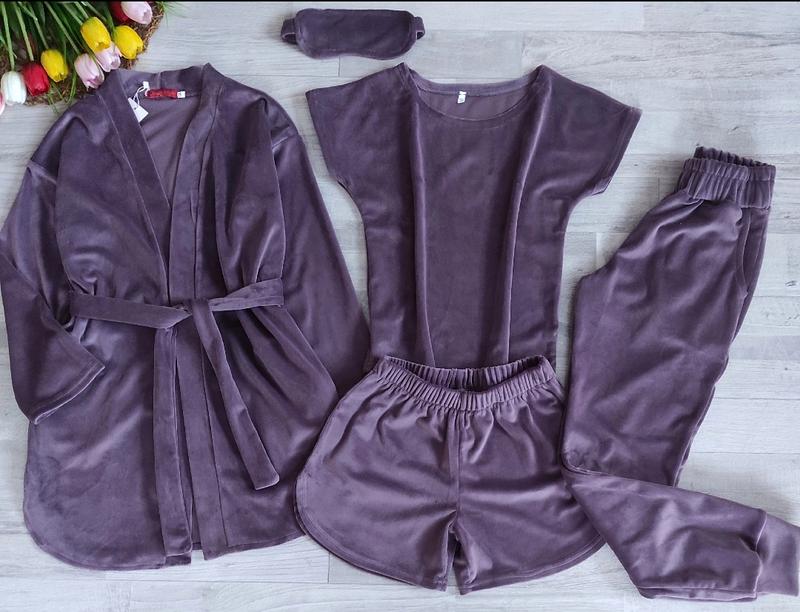 Велюровая пижама из 5 предметов -халат с поясом и карманами -футболка -шорти -брюки с карманами -маска на глаза ОТМЕННАЯ КАЧЕСТВО! замеры: длина халата/пог/рукав от горловины/длина футболки/пог/длина шорты/пот/длина брюк/шаг/пот/пот/пот 134-72/48/56/51/41/29/27/86/66/26/48 152-80/51/63/56/42/32/30/95/72/29/51 158-84/53/66/57/45/32/31/97/75/30/53 +-2см