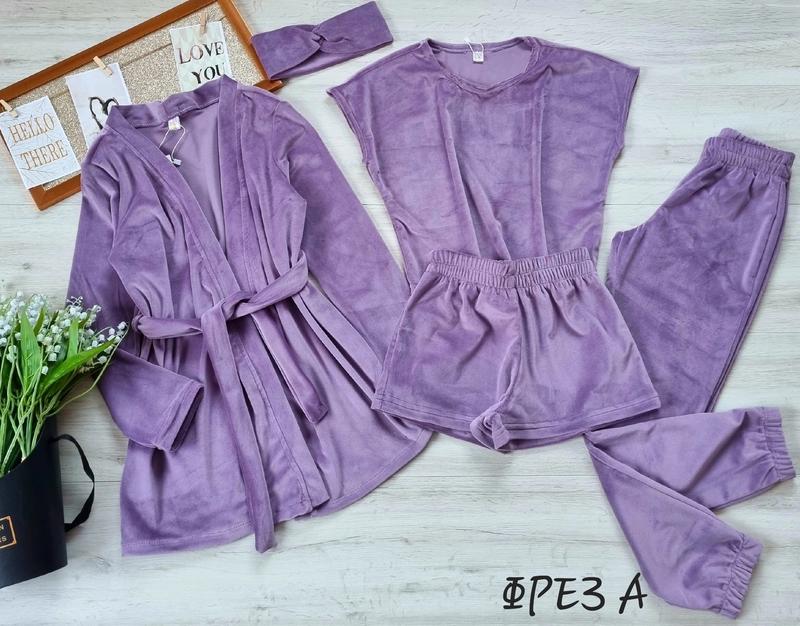 ландыш В НАЯВНОСТІ!!! Мега новинка Комплект 5в1 Ткань королевский велюр В комплект входять: -футболка-топ, -шорти -брюки под РЕЗИНКУ -халат с поясом -повязка КАЧЕСТВО СУПЕР! ПОЛНОМЕРНЫЕ!!! 134(2 шт)-длина халата 61,рукав 47,пог 41,длина футболки 40, пог 42,длина брюк 80,крок 60,пояс 25,длина шорт 26,пояс 25 140(3 шт)-длина халата 63,рукав 48, пог 43, длина футболки 42, пог 43, длина брюк 86, крок 65,пояс 26,длина шорт 27,пояс 26 146(1 шт)-длина халата 69,рукав 50,пог 44,длина футболки 46, пог 45,длина брюк 92,крок 70,пояс 27,длина шорт 28,пояс 27 152(2 шт)-длина халата 72,рукав 52, пог 48, длина футболки 47, пог 47, длина брюк 98, крок 73,пояс 28,длина шорт 30,пояс 28
