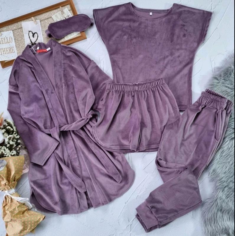 ландыш МЕГА КОМПЛЕКТ 5 в 1 Велюровая пижамка -халат с поясом и карманами -футболка -шорти -брюки с карманами -маска на глаза ОТМЕННАЯ КАЧЕСТВО! 134р (3 шт) халат 72, пог 48, рукав от горловины 56, футболка 51, пог 41, шорты 29, пот 27, штаны 86, крок 66, пот 26, поб 48 140р (2 шт) халат 75, пог 49, рукав от горловины 58, футболка 52, пог 41, шорты 29, пот 28, штаны 88, крок 67, пот 27, поб 49 146р (1 шт) халат 78, пог 50, рукав от горловины 61, футболка 53, пог 42, шорты 31, пот 30, брюки 92, крок 70, пот 29, поб 50 152р (2 шт) халат 80, пог 51, рукав от горловины 63, футболка 56, пог 42, шорты 32, пот 30, штаны 95, крок 72, пот 29, поб 51 +-2 см