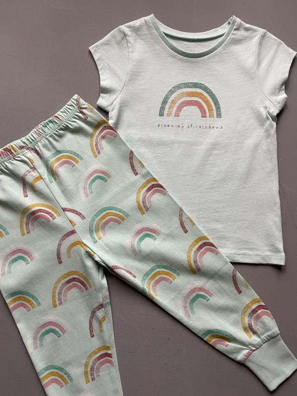 Зручна піжама для дівчинки: футболка та штани. Розмір 2-3 роки ( зріст 92-98см) Склад 100% бавовна, манжети: 97% бавовна, 3% еластан Заміри футболки: 98см. . Довжина 41см. . Ширина по лінії груді 30см. . Заміри штанів: Довжина 55см. . Довжина кроку 36см. . Ширина по поясу 24см.