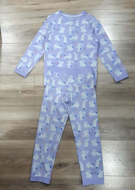 Піжама в зайчики на 6-7 років, стан відмінний. Тканина-бавовна. Верх: довжина 45 см, ширина 32 см, рукав 41см Низ: довжина 67 см, крок 51 см, пояс 26 см.