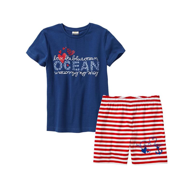 Летний,яркий комплект пижамы для девочки в морском стиле отлично подойдет для отдыха,сна. Состав 100%хлопок Отличное Европейское качество!! Производитель Германия. р.98/104 Футболка длина от плеча-44 ширина-33 шорты: длина-29 шаг-12 пояс-21 резинка. р.110/116 Футболка длина от плеча-48 ширина-34 шорты: длина-30 шаг-12 пояс-23 резинка. р.122/128 Футболка длина от плеча-51 ширина-37 шорты: длина-32,5 шаг-12,5 пояс-26 резинка.