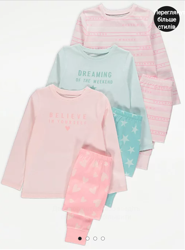 Пижамы фирмы George Тканина 100% cotton Размер 3-4, 8-9 Замеры 3-4 Кофта Дл. 40см Рукав 36см Под проймами 30,5см - Штани Длина 58см По внутреннему шву 37см Пояс 24см ========= Замеры 8-9 Кофта Дл. 48см Рукав 45см Под проймами 36см ------ Штани Длина 82см По внутреннему шву 57см Пояс 29см