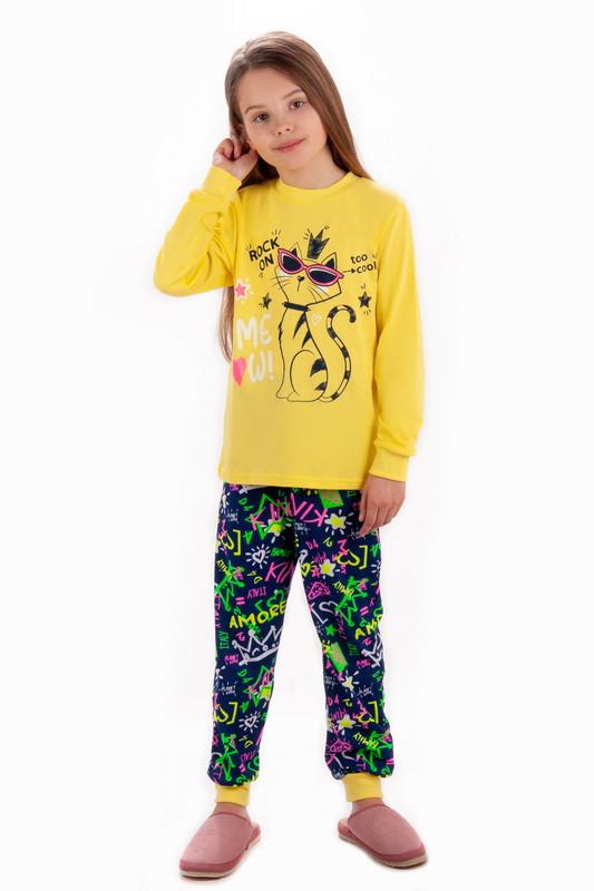 Зручна та комфортна піжама для дівчат, виконана з полотна "Кулір". Модель складається з джемпера та штанів в комбінації однотонного та принтованого полотна, рукава та низ штанини на еластичних манжетах, кофтинка спереду прикрашена милим малюнком, який виконано методом шовкотрафаретного друку. Така річ буде відмінним варіантом для сну або просто в якості домашнього комплекту - завдяки високому вмісту бавовни не викликає подразнень та алергічних реакцій. Полотно: кулір. Склад: 100% бавовна. Рекомендації з догляду: прати при температурі не більше 30°C. Полотно містить бавовну, після прання дає усадку. Прохання враховувати це при підборі розміру.