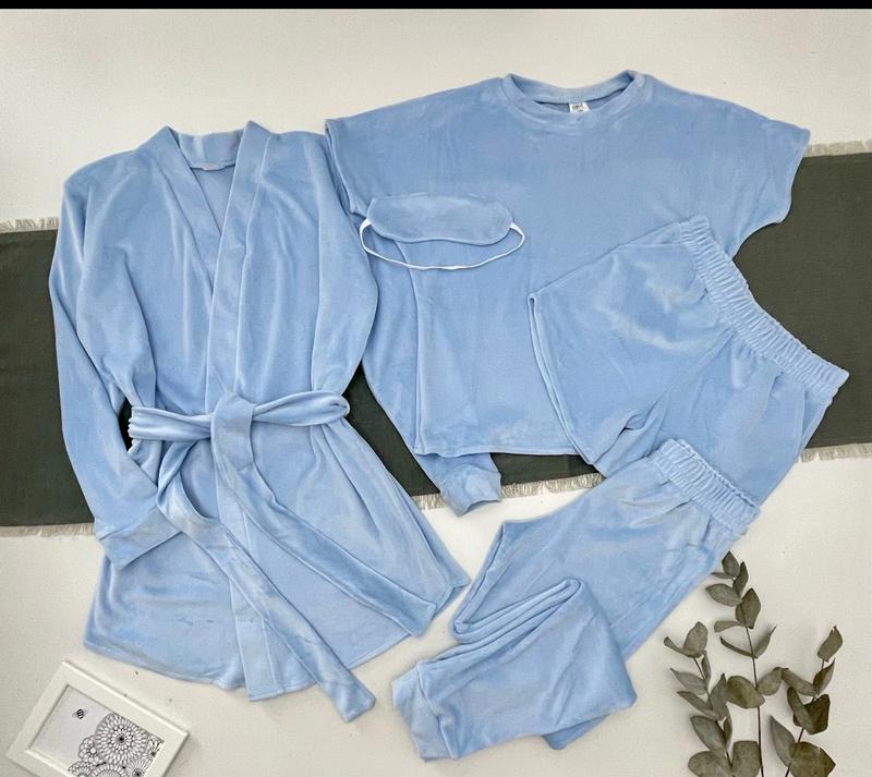 Арт 3226 Комплект 5в1 Ткань - королевский велюр В комплект входять: -халат с поясом -футболка-топ, -шорты с карманами -штани -маска на глаза рост/длин.халата/пог/рукав от горловины/длин.штанов/крок/пот/поб/длин.футболки/пог/длин.шорт/пот похибка+-3см 146/71/43/58/84/63/28/41/49/42/24/28-2шт 152/73/44/60/88/64/28/43/50/43/25/28-4шт 158/74/46/62/91/67/29/45/51/45/25/30-1шт 164/75/48/64/94/70/31/47/52/47/26/32-3шт