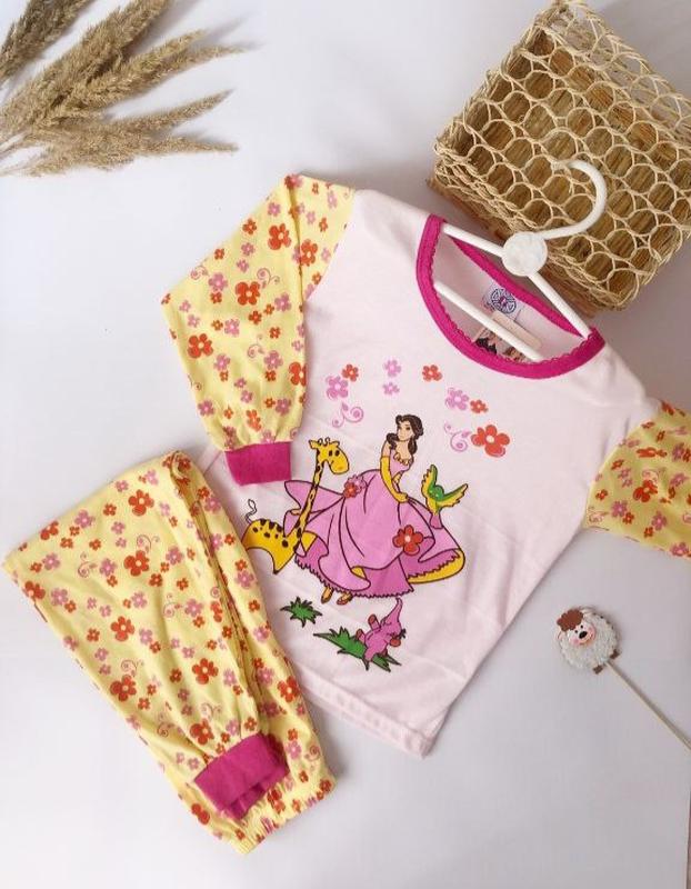 Пижама для девочки из натуральной ткани. Размер на рост 122-128 см, замеры: кофта - ширина 36 см, длина 48 см, рукав 39 см; брюки: ширина 38, длина 69 см