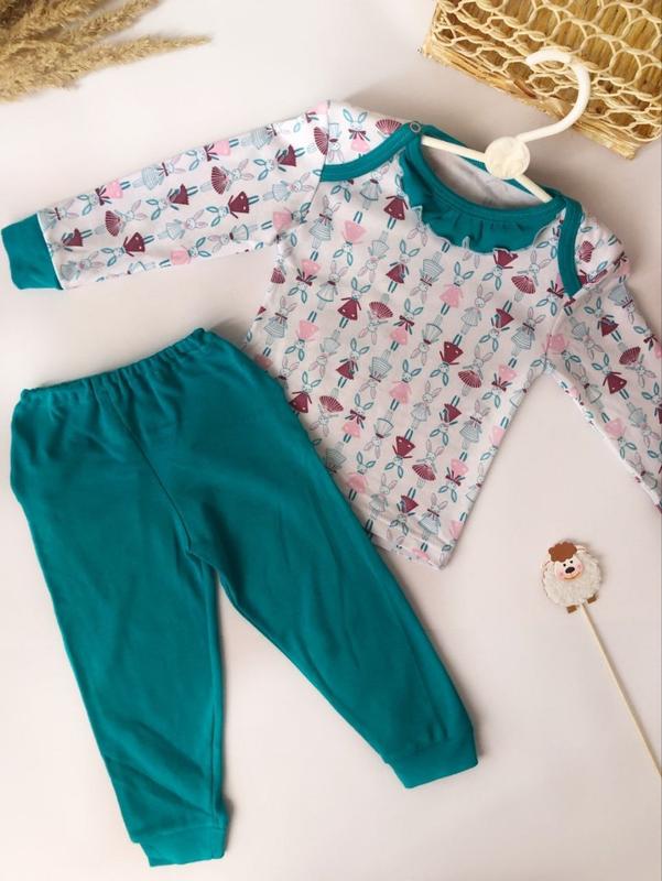 Пижама для девочки Размер 30 (рост 104-110 см), замеры: кофта: ширина 31 см, длина 42 см, рукав 38 см; брюки: ширина 29 см; длина 63 см. Размер 24 (рост 80-86 см) замеры: кофта: ширина 25 см, длина 34 см, рукав 29 см; брюки: ширина 23 см; длина 46 см.