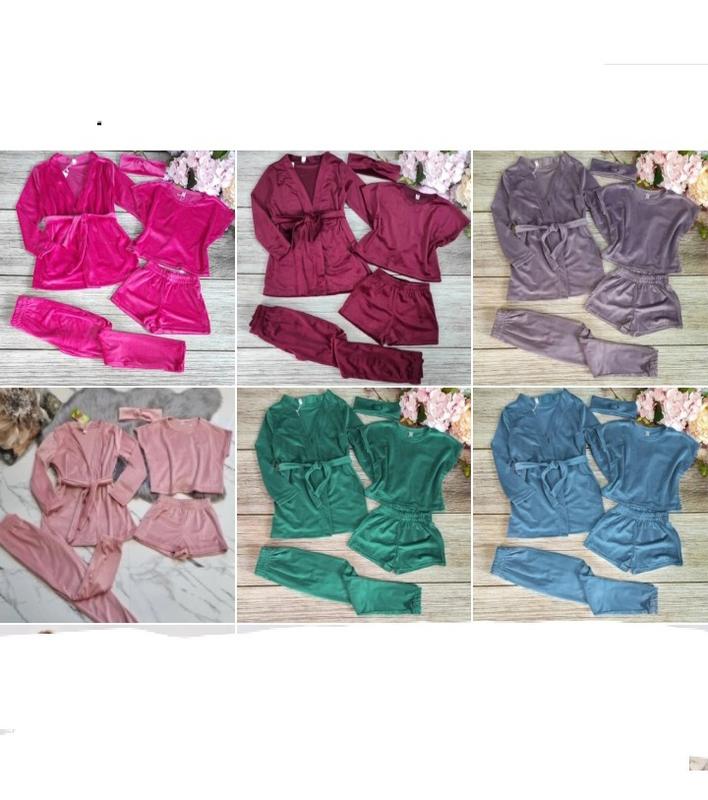 💐💐💐 Мега новинка Комплект 5в1 Ткань королевский велюр В комплект входять: -футболка-топ, -шорти -штани -халат с поясом -повязка КАЧЕСТВО СУПЕР! ПОЛНОМЕРНЫЕ!!! Цена 1200 грн халат длин/рукав/пог/футболка длин/пог/штаны длин / крок /пояс / шорты длин /пояс 140р-63/48/43/42/43/87/66/26/27/26 146р-70/52/44/46/45/92/71/27/28/27 152р-72/51/48/47/47/98/73/28/30/28 158р-75/58/50/49/48/102/78/29/32/29 164р-77/60/51/51/50/105/82/30/33/30 170р(S)-79/63/53/52/53/107/84/31/34/31 -+2см 140р-2 шт 146р-2 шт 152р-2 шт 158р-2 шт 164р-2 шт 170(S)- 2 шт