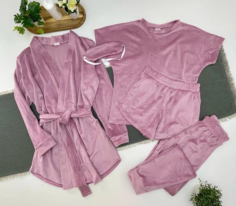 Арт 3506 Комплект 5в1 Ткань - королевский велюр В комплект входять: -халат с поясом -футболка-топ, -шорты с карманами -штани -маска на глаза рост/длин.халата/пог/рукав от горловины/длин.штанов/крок/пот/поб/длин.футболки/пог/длин.шорт/пот похибка+-3см 152/73/44/60/88/64/28/43/50/43/25/28-1шт 158/74/46/62/91/67/29/45/51/45/25/30-1шт