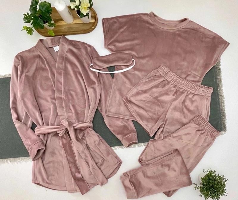 Арт 3228 Комплект 5в1 Ткань - королевский велюр В комплект входять: -халат с поясом -футболка-топ, -шорты с карманами -штани -маска на глаза рост/длин.халата/пог/рукав от горловины/длин.штанов/крок/пот/поб/длин.футболки/пог/длин.шорт/пот похибка+-3см 146/71/43/58/84/63/28/41/49/42/24/28-3шт 158/74/46/62/91/67/29/45/51/45/25/30-2шт