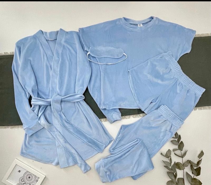 арт 3226 Комплект 5в1 Ткань - королевский велюр В комплект входять: -халат с поясом -футболка-топ, -шорты с карманами -штани -маска на глаза рост/длин.халата/пог/рукав от горловины/длин.штанов/крок/пот/поб/длин.футболки/пог/длин.шорт/пот похибка+-3см 146/71/43/58/84/63/28/41/49/42/24/28-2шт 152/73/44/60/88/64/28/43/50/43/25/28-2шт 158/74/46/62/91/67/29/45/51/45/25/30-2шт 164/75/48/64/94/70/31/47/52/47/26/32-4шт