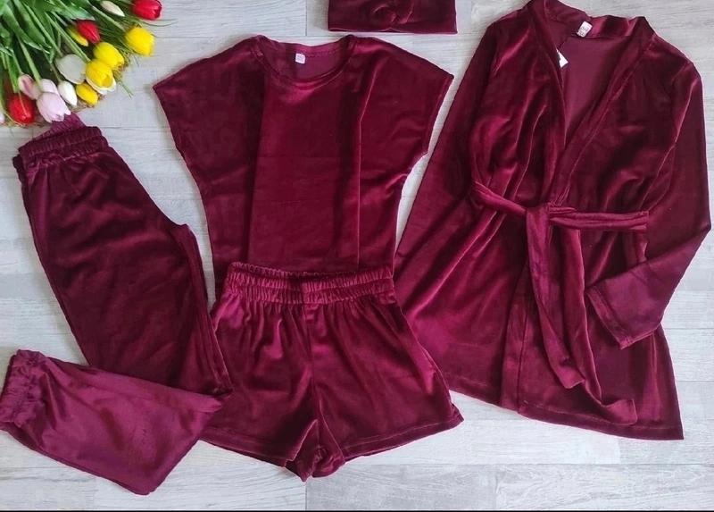 Мега новинка Комплект 5в1 Ткань королевский велюр В комплект входять: -футболка-топ, -шорти -штани -халат с поясом -повязка замеры:халат длин/рукав/пог/футболка длин/пог/понтаны длин/шаг/пояс/шорты длин/пояс 140р-63/48/43/42/43/87/66/26/27/26 158р-75/58/50/49/48/102/78/29/32/29