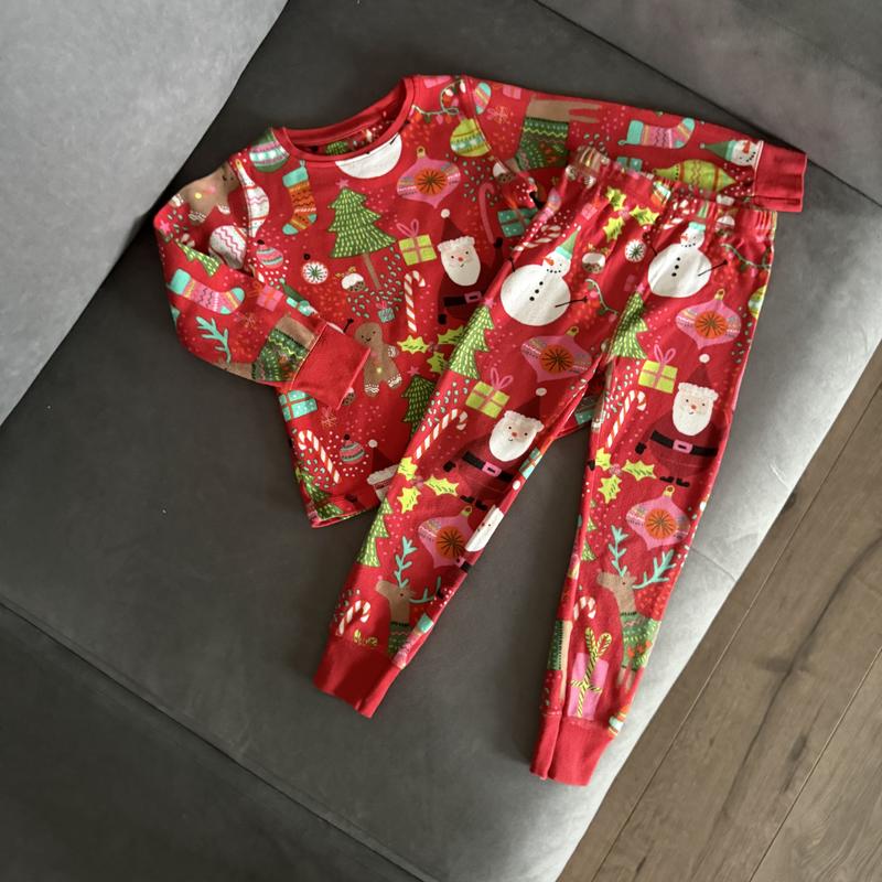 Класна новорічна піжама. Фірми next. На вік 3-4 роки. Верх довжина 38 см, плечі 25 см, рукав 36 см. Низ пояс 24 см, довжина 58 см, шаг 41 см.