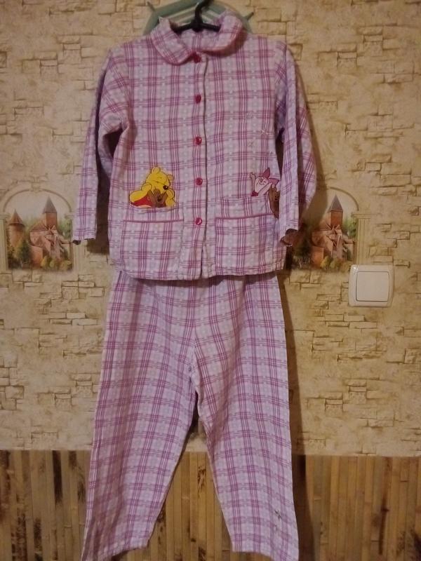 Пижама на девочку,меет следы ношения, не столь яркая как на фото, материалал плотный х.б, Замеры брюки длина 65см,полуоб*м 39см,кофта длина 43см,полуоб*ем под руками 36см,рукав от плеча 39см
