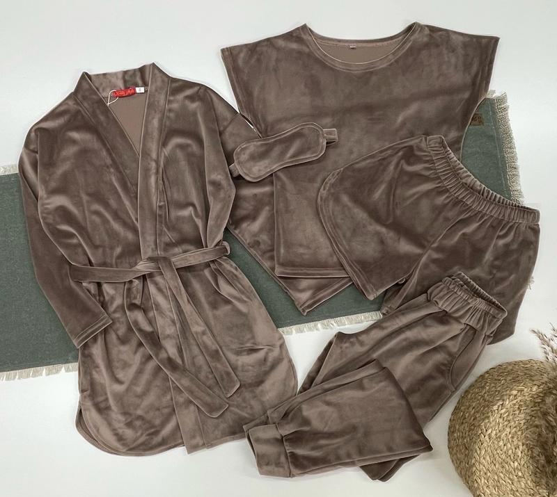 Таня арт 4028 СУПЕР КОМПЛЕКТ! Велюровая пижама из 5 предметов -халат с поясом и карманами -футболка -шорти -брюки с карманами -маска на глаза ОТМЕННАЯ КАЧЕСТВО! рост/длин.халата/пог/рукав от горловины/длин.ф./пог/длин.шорт/пот/дл.штанов/крок/пот/поб похибка+-2см 134/72/48/56/51/41/29/27/86/66/26/48-3шт 140/75/49/58/52/41/29/28/88/67/27/49-3шт