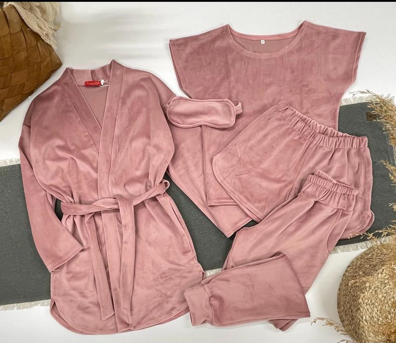 арт 1104 СУПЕР КОМПЛЕКТ! Велюровая пижама из 5 предметов цвет ПУДРА -халат с поясом и карманами -футболка -шорти -брюки с карманами -маска на глаза ОТМЕННАЯ КАЧЕСТВО! рост/длин.халата/пог/рукав от горловины/длин.ф./пог/длин.шорт/пот/дл.штанов/крок/пот/поб похибка+-2см 134/72/48/56/51/41/29/27/86/66/26/48-11шт 140/75/49/58/52/41/29/28/88/67/27/49-2шт