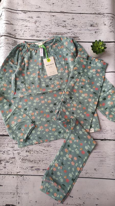 White Stuff, Англия Непревзойденного качества! 98% високоякісна бавовна Ткань плотная, довольно классно тянется. Отлично держит форму! Она ни в коем случае не разлезится после стирки, а будет радовать Вас и Вашу малышку долгое время! Таким вещам просто нет износа) Низ штанишек на манжетах. Рукава оригинально присобраны на низу. Фирменные лейбы. Горловина имеет v- образный вырез. Идеально как домашний костюм. Дуууууже круто на подарунок 🎁 Невероятно красивый нежный цветочный принт. Количество ограничено 🐌 9-10 лет (134-140 см) длина кофты 54 рукав от горловины 61 см пог 39 штаны пот 30, тянется 39 длина 80+3,5 см манжет шаг 58 +3,5 манжет