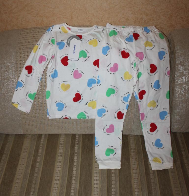 Новая очень красивая пижама в сердечки девочке 8-9 (на рост 128-134см), 9-10 (на рост 134-140см), 10-11 лет (на рост 140-146см) от LC Wakiki, Турция. Не маломерят. Супер качество, трикотажная, состав: 100% хлопок. У брюк манжеты на резинке. Замеры 8-9 лет: замеры реглана длина 49см, ПОГ 35см, рукав 45,5см. замеры брюк: длина 78см, шаг 56см, ПОТ 28см, ПОБ 35см. Замеры других размеров сделают по запросу. Цена размера 8-9 лет 399 грн, цена размера 9-10 и 10-11 лет 425грн).