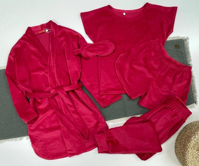 арт 4011 СУПЕР КОМПЛЕКТ! Велюрова піжама з 5 предметів -халат з поясом та кишенями -футболка -шорти -штани з кишенями -маска на очі ВІДМІННА ЯКІСТЬ! зріст/довж.халата/пог/рукав від горловини/довж.ф./пог/довж.шорт/пот/довж.штанів/крок/пот/поб похибка+-2см 140/75/49/58/52/41/29/28/88/67/27/49-1шт 158/84/53/66/57/45/32/31/97/75/30/53-6шт