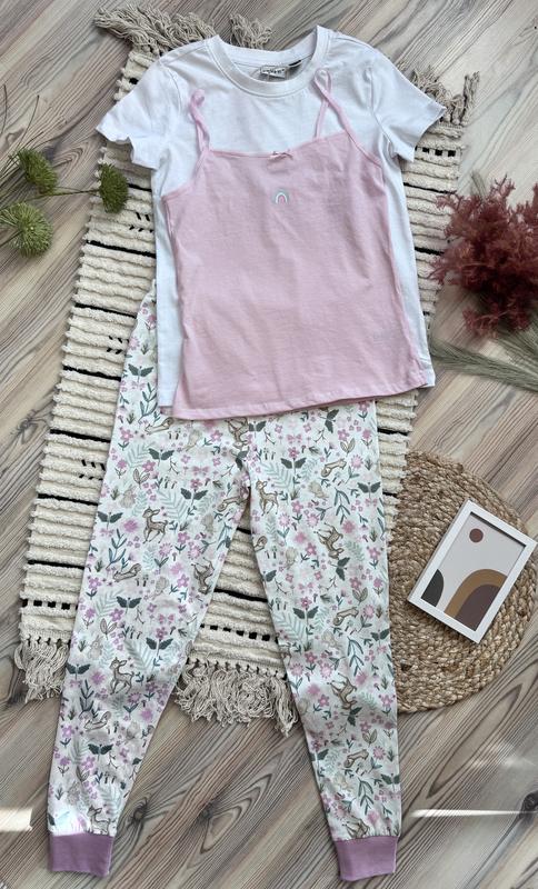 Піжама або домашній костюм для дівчинки 134-140 см Штани довжина 89,пояс 29,стегна 38,шаг58 Футболка довжина 51,пог37 Майка довжина 48,пог32 Ціна комплекту 200 грн